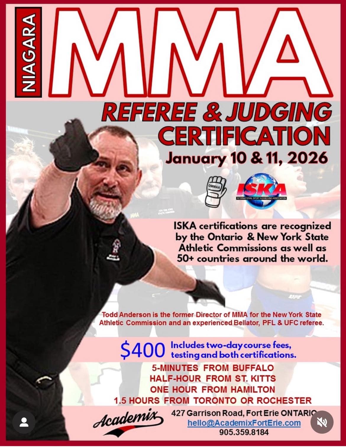 Cette formation de deux jours, animée par Todd Anderson, comprend des cours d’arbitrage et de jugement, des examens et des certificats. La certification ISKA est reconnue par les commissions athlétiques de l’Ontario et de New York, ainsi que par plus de 50 pays à travers le monde.
