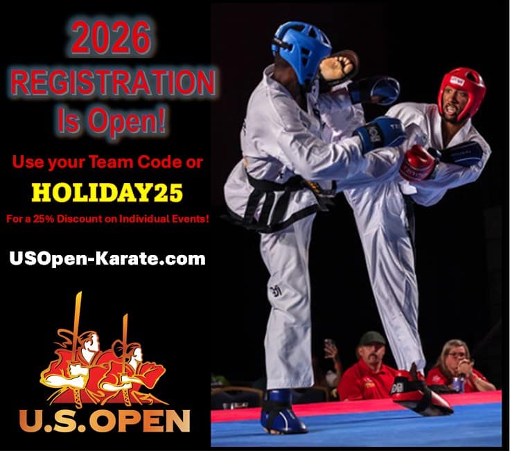 Réputé comme l’événement le plus familial du karaté sportif, l’OPEN accueille des compétiteurs de tous âges et de tous niveaux, offrant 1 400 divisions diverses. Aucune affiliation NASKA ou ISKA n’est requise pour participer au tournoi principal 6A. Profitez des prix réduits par division (près d’un tiers de réduction) disponibles jusqu’à la fin de l’année et obtenez les meilleures places réservées pour les diffusions internationales. Ne manquez pas ça, on se retrouve là-bas !